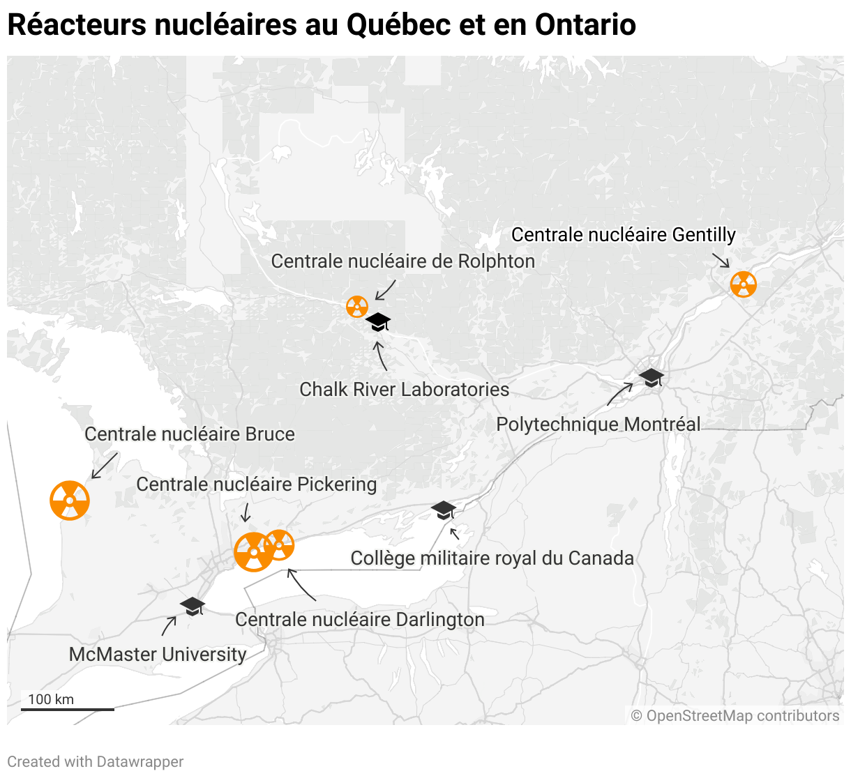 Le Canada a acquis de l’expérience très tôt dans le domaine de la technologie nucléaire. En 1908, le prix Nobel de chimie est décerné à Ernest Rutherford pour son travail sur la décroissance radioactive réalisé à l’Université McGill. En 1940, George C. Laurence conçoit l’un des premiers réacteurs nucléaires au monde à Ottawa. Pendant la Seconde Guerre mondiale, l’Université de Montréal accueille un laboratoire secret, le produit d’une alliance entre le Canada, le Royaume-Uni et les États-Unis. On y conçoit le réacteur de recherche NRX [National Research Experimental] et une usine d’extraction de plutonium. On prévoit leur construction à Chalk River, à 180 km au nord d’Ottawa. En date d’aujourd’hui, 20 réacteurs nucléaires sont actifs en Ontario.